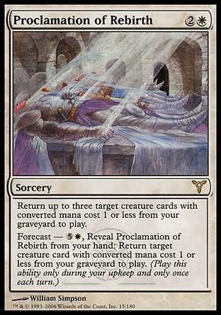 Forecast - , Reveal Proclamation of Rebirth from your hand: Return target creature card with converted mana cost 1 or less from your graveyard to the battlefield. (Activate this ability only during your upkeep and only once each turn.)