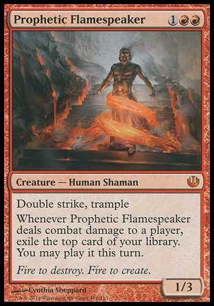 | Card Text | Double strike, trample Whenever Prophetic Flamespeaker deals combat damage to a player, exile the top card of your library. You may play it this turn. |