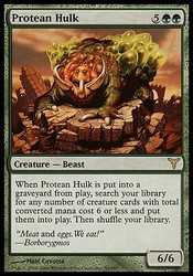 Card TextWhen Protean Hulk dies, search your library for any number of creature cards with total converted mana cost 6 or less and put them onto the battlefield. Then shuffle your library.