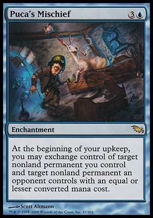 Card TextAt the beginning of your upkeep, you may exchange control of target nonland permanent you control and target nonland permanent an opponent controls with an equal or lesser converted mana cost.
