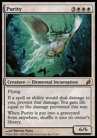 | Card Text | Flying If noncombat damage would be dealt to you, prevent that damage. You gain life equal to the damage prevented this way. When Purity is put into a graveyard from anywhere, shuffle it into its owner"s library. |