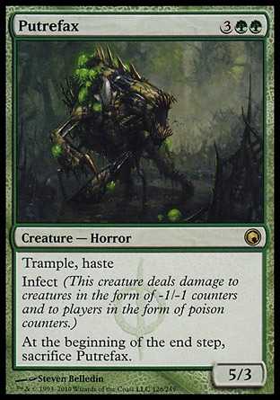 | Card Text | Trample, haste Infect (This creature deals damage to creatures in the form of -1/-1 counters and to players in the form of poison counters.) At the beginning of the end step, sacrifice Putrefax. |