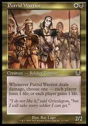 | Card Text | Whenever Putrid Warrior deals damage, choose one - • Each player loses 1 life. • Each player gains 1 life. |