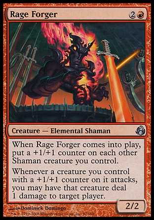 | Card Text | When Rage Forger enters the battlefield, put a +1/+1 counter on each other Shaman creature you control. Whenever a creature you control with a +1/+1 counter on it attacks, you may have that creature deal 1 damage to target player. |