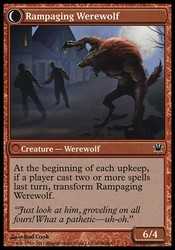 | Card Text | At the beginning of each upkeep, if a player cast two or more spells last turn, transform Rampaging Werewolf. |