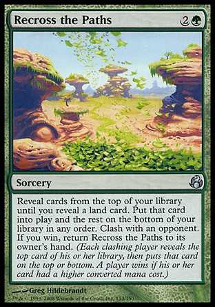 Card TextReveal cards from the top of your library until you reveal a land card. Put that card onto the battlefield and the rest on the bottom of your library in any order. Clash with an opponent. If you win, return Recross the Paths to its owner"s hand. (Each clashing player reveals the top card of his or her library, then puts that card on the top or bottom. A player wins if his or her card had a higher converted mana cost.)