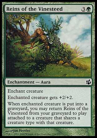 | Card Text | Enchant creature Enchanted creature gets +2/+2. When enchanted creature dies, you may return Reins of the Vinesteed from your graveyard to the battlefield attached to a creature that shares a creature type with that creature. |