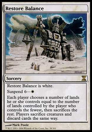 | Card Text | Suspend 6- (Rather than cast this card from your hand, pay and exile it with six time counters on it. At the beginning of your upkeep, remove a time counter. When the last is removed, cast it without paying its mana cost.)Each player chooses a number of lands he or she controls equal to the number of lands controlled by the player who controls the fewest, then sacrifices the rest. Players sacrifice creatures and discard cards the same way. |