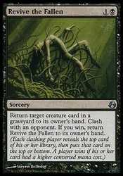 Card TextReturn target creature card from a graveyard to its owner"s hand. Clash with an opponent. If you win, return Revive the Fallen to its owner"s hand. (Each clashing player reveals the top card of his or her library, then puts that card on the top or bottom. A player wins if his or her card had a higher converted mana cost.)