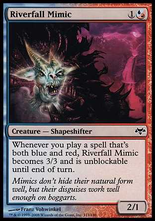 | Card Text | Whenever you cast a spell that"s both blue and red, Riverfall Mimic has base power and toughness 3/3 until end of turn and can"t be blocked this turn. |