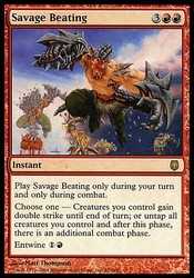 | Card Text | Cast Savage Beating only during your turn and only during combat. Choose one - • Creatures you control gain double strike until end of turn. • Untap all creatures you control. After this phase, there is an additional combat phase. Entwine |