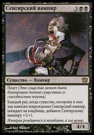 | Card Text | Flying (This creature can"t be blocked except by creatures with flying or reach.) Whenever a creature dealt damage by Sengir Vampire this turn dies, put a +1/+1 counter on Sengir Vampire. |
