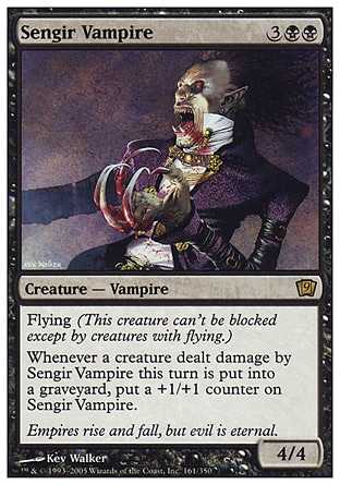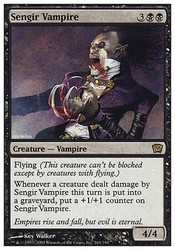 | Card Text | Flying (This creature can"t be blocked except by creatures with flying or reach.) Whenever a creature dealt damage by Sengir Vampire this turn dies, put a +1/+1 counter on Sengir Vampire. |