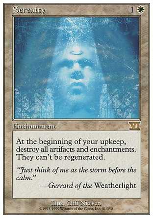 | Card Text | At the beginning of your upkeep, destroy all artifacts and enchantments. They can"t be regenerated. |