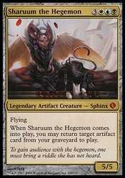 | Card Text | Flying When Sharuum the Hegemon enters the battlefield, you may return target artifact card from your graveyard to the battlefield. |
