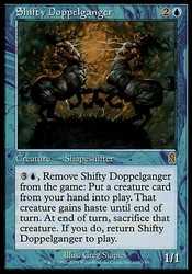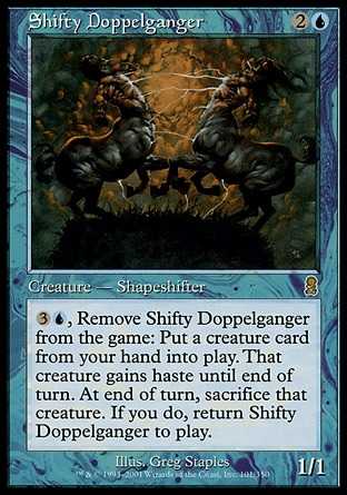 | Card Text | ![]() , Exile Shifty Doppelganger: You may put a creature card from your hand onto the battlefield. If you do, that creature gains haste until end of turn. At the beginning of the next end step, sacrifice that creature. If you do, return Shifty Doppelganger to the battlefield. |