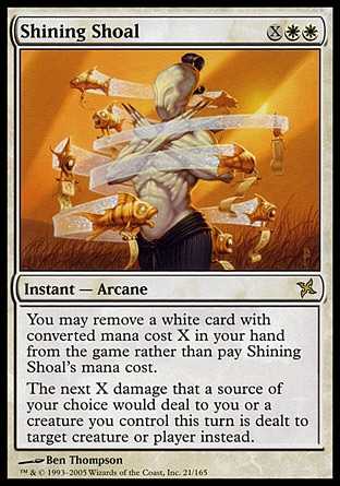 | Card Text | You may exile a white card with converted mana cost X from your hand rather than pay Shining Shoal"s mana cost. The next X damage that a source of your choice would deal to you and/or creatures you control this turn is dealt to target creature or player instead. |