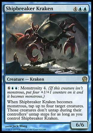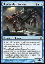 | Card Text | ![]() ![]() : Monstrosity 4. (If this creature isn"t monstrous, put four +1/+1 counters on it and it becomes monstrous.)When Shipbreaker Kraken becomes monstrous, tap up to four target creatures. Those creatures don"t untap during their controllers" untap steps for as long as you control Shipbreaker Kraken. |