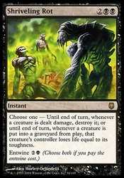 | Card Text | Choose one - • Until end of turn, whenever a creature is dealt damage, destroy it. • Until end of turn, whenever a creature dies, that creature"s controller loses life equal to its toughness. Entwine |