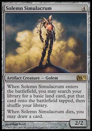 | Card Text | When Solemn Simulacrum enters the battlefield, you may search your library for a basic land card, put that card onto the battlefield tapped, then shuffle your library. When Solemn Simulacrum dies, you may draw a card. |