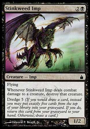 | Card Text | Flying Whenever Stinkweed Imp deals combat damage to a creature, destroy that creature. Dredge 5 (If you would draw a card, instead you may put exactly five cards from the top of your library into your graveyard. If you do, return this card from your graveyard to your hand. Otherwise, draw a card.) |