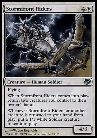 | Card Text | Flying When Stormfront Riders enters the battlefield, return two creatures you control to their owner"s hand. Whenever Stormfront Riders or another creature is returned to your hand from the battlefield, put a 1/1 white Soldier creature token onto the battlefield. |