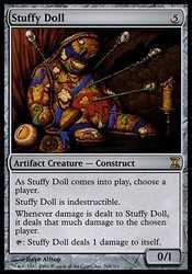 Whenever Stuffy Doll is dealt damage, it deals that much damage to the chosen player.