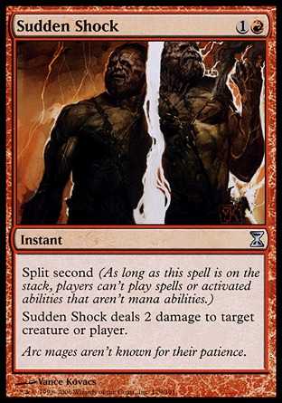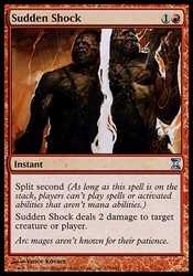 | Card Text | Split second (As long as this spell is on the stack, players can"t cast spells or activate abilities that aren"t mana abilities.) Sudden Shock deals 2 damage to target creature or player. |
