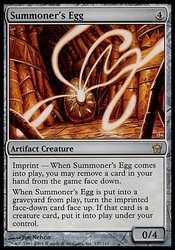 | Card Text | Imprint - When Summoner"s Egg enters the battlefield, you may exile a card from your hand face down. When Summoner"s Egg dies, turn the exiled card face up. If it"s a creature card, put it onto the battlefield under your control. |