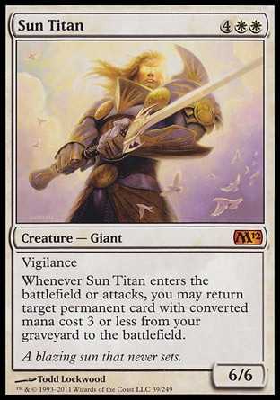 | Card Text | Vigilance Whenever Sun Titan enters the battlefield or attacks, you may return target permanent card with converted mana cost 3 or less from your graveyard to the battlefield. |