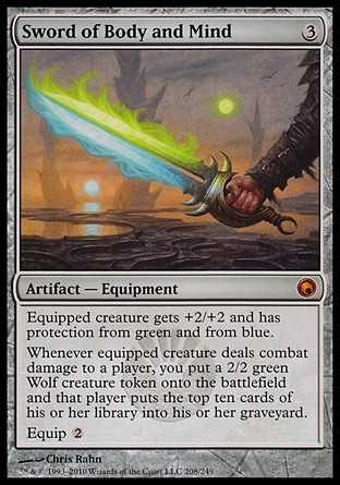 | Card Text | Equipped creature gets +2/+2 and has protection from green and from blue. Whenever equipped creature deals combat damage to a player, you put a 2/2 green Wolf creature token onto the battlefield and that player puts the top ten cards of his or her library into his or her graveyard. Equip |