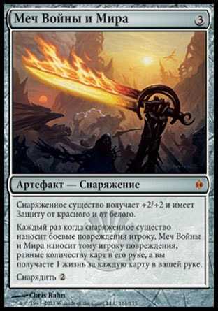 Whenever equipped creature deals combat damage to a player, Sword of War and Peace deals damage to that player equal to the number of cards in his or her hand and you gain 1 life for each card in your hand.
