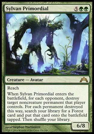 When Sylvan Primordial enters the battlefield, for each opponent, destroy target noncreature permanent that player controls. For each permanent destroyed this way, search your library for a Forest card and put that card onto the battlefield tapped. Then shuffle your library.