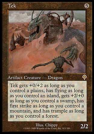 | Card Text | Tek gets +0/+2 as long as you control a Plains, has flying as long as you control an Island, gets +2/+0 as long as you control a Swamp, has first strike as long as you control a Mountain, and has trample as long as you control a Forest. |