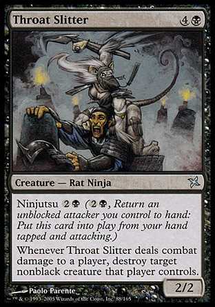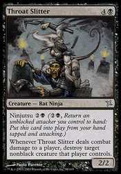 | Card Text | Ninjutsu ![]() (![]() , Return an unblocked attacker you control to hand: Put this card onto the battlefield from your hand tapped and attacking.)Whenever Throat Slitter deals combat damage to a player, destroy target nonblack creature that player controls. |