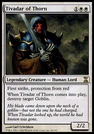 | Card Text | First strike, protection from red When Tivadar of Thorn enters the battlefield, destroy target Goblin. |