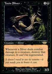 | Card Text | Whenever a Sliver deals combat damage to a creature, destroy that creature. It can"t be regenerated. |