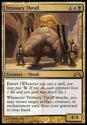| Card Text | Extort (Whenever you cast a spell, you may pay . If you do, each opponent loses 1 life and you gain that much life.)Whenever Treasury Thrull attacks, you may return target artifact, creature, or enchantment card from your graveyard to your hand. |