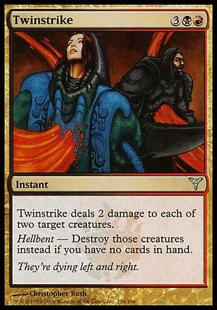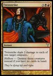 | Card Text | Twinstrike deals 2 damage to each of two target creatures. Hellbent - Destroy those creatures instead if you have no cards in hand. |
