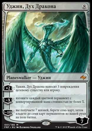 | Card Text | +2: Ugin, the Spirit Dragon deals 3 damage to target creature or player. в€’X: Exile each permanent with converted mana cost X or less that"s one or more colors. в€’10: You gain 7 life, draw seven cards, then put up to seven permanent cards from your hand onto the battlefield. |
