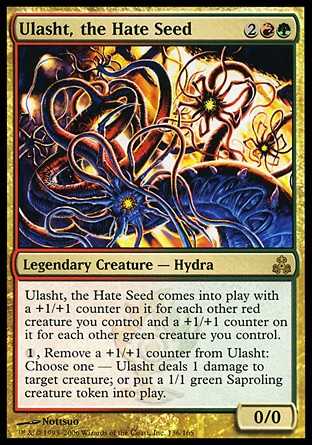 Card TextUlasht, the Hate Seed enters the battlefield with a +1/+1 counter on it for each other red creature you control and a +1/+1 counter on it for each other green creature you control.