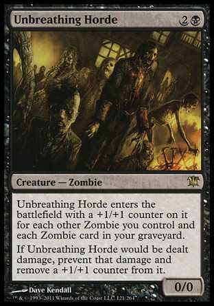 | Card Text | Unbreathing Horde enters the battlefield with a +1/+1 counter on it for each other Zombie you control and each Zombie card in your graveyard. If Unbreathing Horde would be dealt damage, prevent that damage and remove a +1/+1 counter from it. |