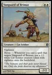 Heroic - Whenever you cast a spell that targets Vanguard of Brimaz, put a 1/1 white Cat Soldier creature token with vigilance onto the battlefield.