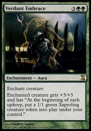 Enchanted creature gets +3/+3 and has At the beginning of each upkeep, put a 1/1 green Saproling creature token onto the battlefield.