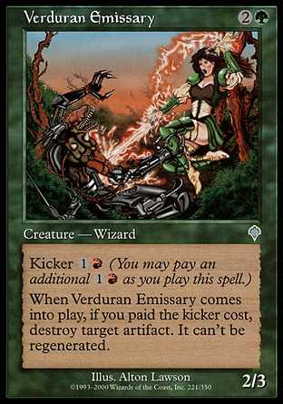 | Card Text | Kicker ![]() (You may pay an additional ![]() as you cast this spell.)When Verduran Emissary enters the battlefield, if it was kicked, destroy target artifact. It can"t be regenerated. |