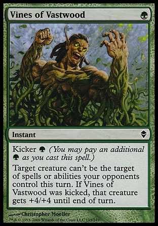| Card Text | Kicker (You may pay an additional as you cast this spell.)Target creature can"t be the target of spells or abilities your opponents control this turn. If Vines of Vastwood was kicked, that creature gets +4/+4 until end of turn. |
