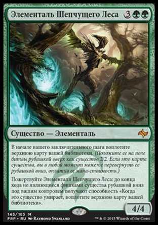| Card Text | At the beginning of your end step, manifest the top card of your library. (Put it onto the battlefield face down as a 2/2 creature. Turn it face up any time for its mana cost if it"s a creature card.) Sacrifice Whisperwood Elemental: Until end of turn, face-up nontoken creatures you control gain |