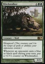 | Card Text | Hexproof (This creature can"t be the target of spells or abilities your opponents control.) Whenever an opponent casts a blue or black spell during your turn, put a +1/+1 counter on Witchstalker. |