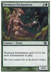 Card TextYavimaya Enchantress gets +1/+1 for each enchantment on the battlefield.