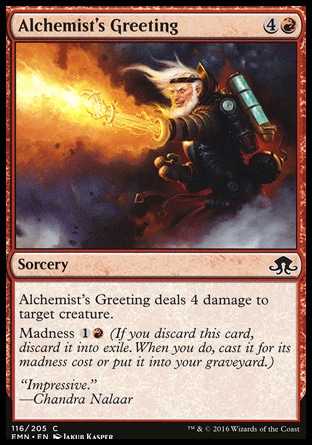 | Card Text | Alchemist's Greeting deals 4 damage to target creature. Madness {1}{R} (If you discard this card, discard it into exile. When you do, cast it for its madness cost or put it into your graveyard.) |